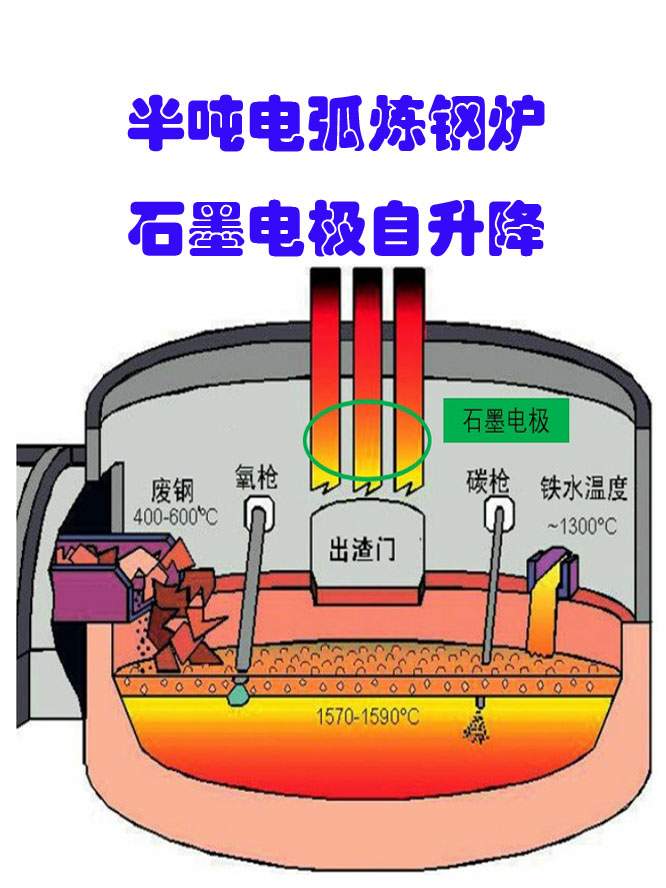 半吨电弧炼钢炉,石墨电极自升降。