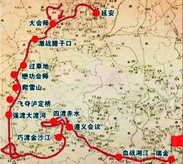 突破井冈山第五次“围剿”的封锁线到达遵义,四渡赤水,抢渡大渡河,飞夺泸定桥,爬雪山过草地。
